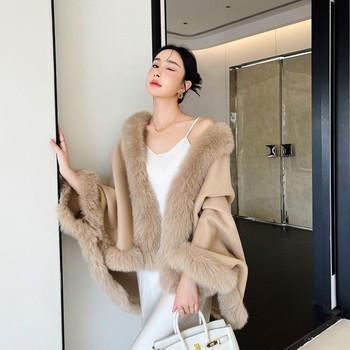 عباءة فاخرة مقاومة للرياح للنساء عباءة دافئة معطف ثعلب فرو مزينة بغرباء من مزيج الصوف على الوجهين