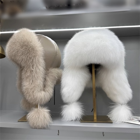 Sombrero de piel de invierno cálido y grueso de lujo para adultos Sombrero de aviador de cuero real Estilo de soldado ruso Sombrero de piel de zorro natural